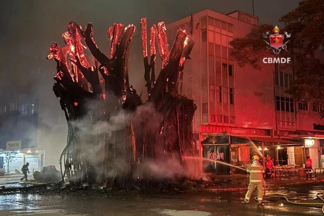 Mais de 40 anos de história se perderam com o incêndio que destruiu uma gameleira localizada entre as quadras 704 e 705 Norte, no Plano Piloto, em Brasília. As chamas começaram na noite do último domingo (12/10) e mobilizaram o Corpo de Bombeiros Militar do Distrito Federal (CBMDF), acionado às 20h04 para conter o fogo.