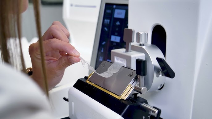 Utilizado em laboratórios de patologia, o micrótomo permite cortar amostras em lâminas extremamente finas, etapa indispensável para exames como biópsias. A partir dessas lâminas, especialistas conseguem observar as células com mais clareza ao microscópio, o que viabiliza a identificação de doenças com base em fragmentos do corpo.